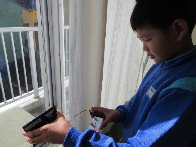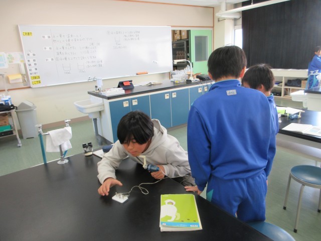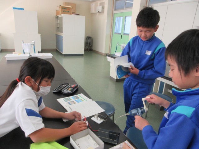 「電気」の学習です。普段の生活の中で電気は欠かせないものです。そもそも電気はどうやってできるのでしょうか。理科室にある手回し発電機やソーラーパネルを使って,明かりを付けてみました。大きな電気を作り出すためには大きな力がいります。これからの学習が楽しみです。