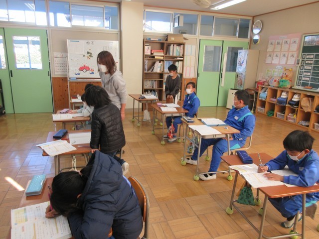 長さの学習をしています。「長いものの長さは、どう表すのか」をめあてに学習しました。長いものの長さは、「m」をつかって表すこと、また、100cm以上の長さは、mとcmをつかって表すことを理解することができました。問題に取り組む時間では、早く終わった子が、まだ終わっていない子の豆先生をするなど、協力して学習に取り組んでいました。