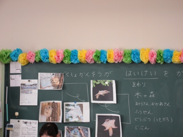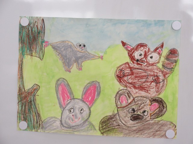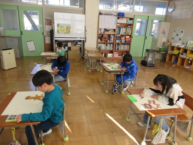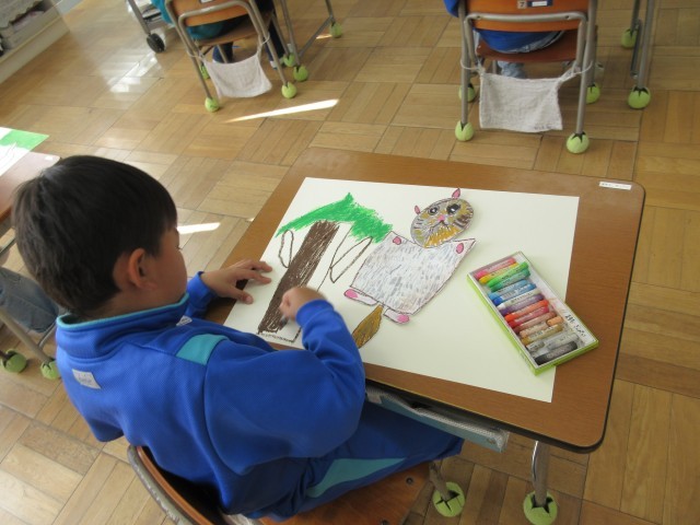 読書感想画を描いています。主人公のモモンガくんをメインに描きました。今日は、大きな画用紙に背景をクレヨンで描きました。1本の木でも、1色の茶色ではなく、いろんな色を使うことで少し立体感が出るよう工夫していました。楽しい絵に仕上がりそうです。