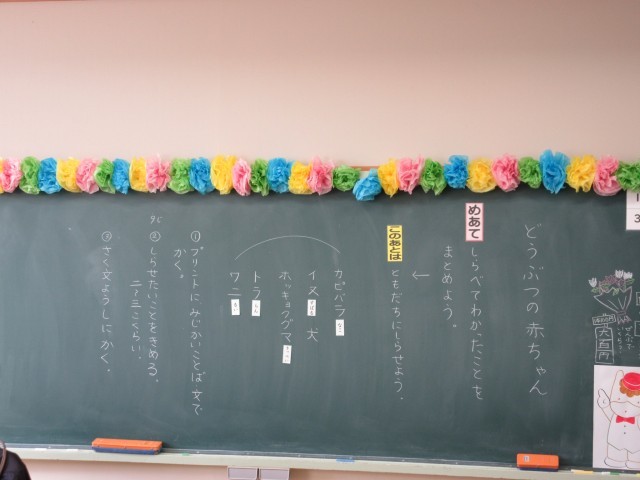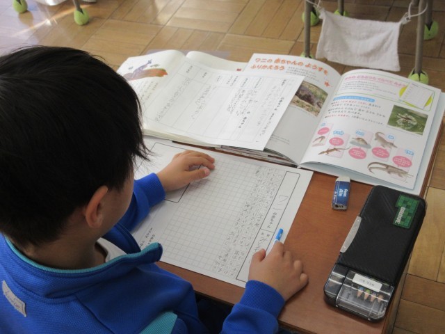 「どうぶつのあかちゃん」の学習を進めています。今は、自分が調べたい動物を決め、図鑑等を使って調べて分かったことをまとめています。知らせる相手はクラスの仲間です。どのようなことを伝えようか、よく考えて学習に取り組んでいます。
