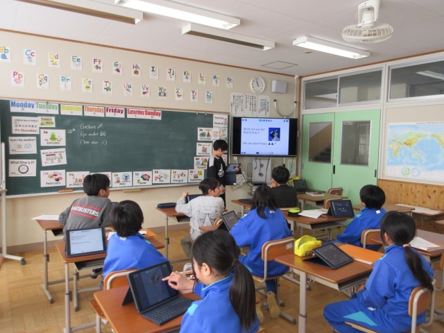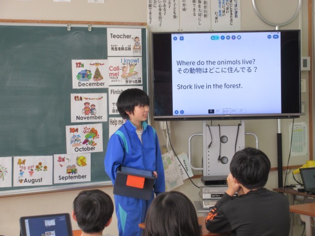 「Let's save the animals.」の学習を行っています。自分が守りたい動物について調べました。今日は、「守りたい動物は何か」、「どこに住んでいる動物か」、「何が大きな問題か」、「自分にできることは何か」について、英語でまとめ、タブレットを活用して一人一人わかりやすく発表することができました。