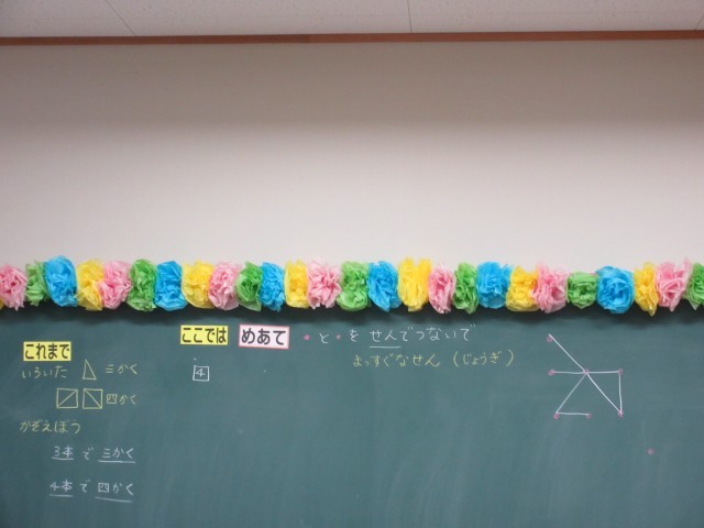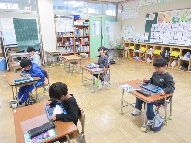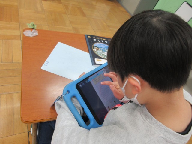 点と点を直線でつないで形作りを学習しました。今まで色板を使って作ってきた形を、今日はタブレットを使って点と点をつなぐ直線でかくことができました。形をかくことも、かき直すこともタブレットでは簡単にでき、効率よく学習に取り組むことができました。