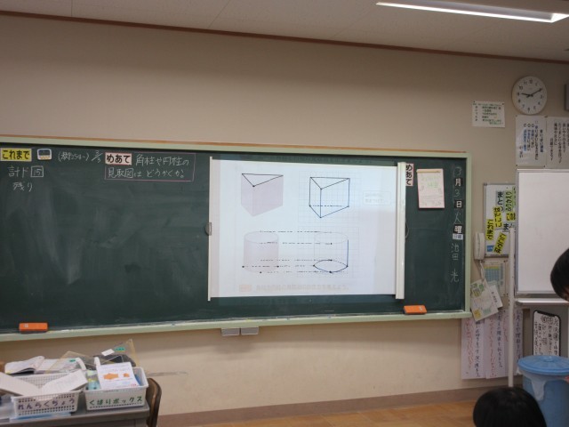 「角柱と円柱の見取り図をどのようにかくとよいのか」をめあてに学習しました。辺の長さや頂点の位置に気を付けること、正確にかくために、コンパスをどのように使うとよいのかなど、一人ひとりが考えて課題に取り組みました。仲間とも教え合うことで、考えを深めることができました。