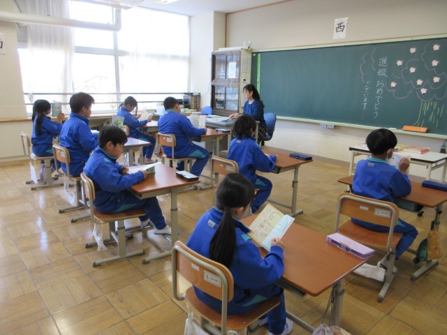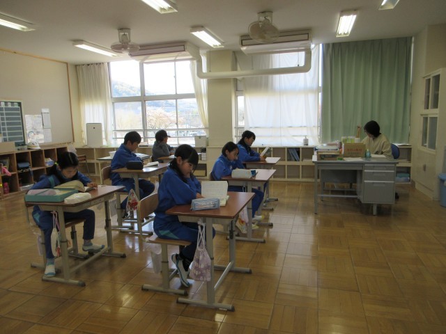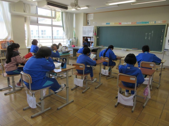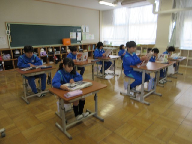 朝の会が終わると朝読書の時間です。高学年は早々と読書に入り,教室は静かになっていました。子供たちだけでなく先生も一緒に読書で,心が落ち着いて穏やかな時間が流れていました。