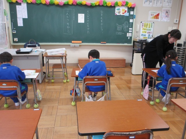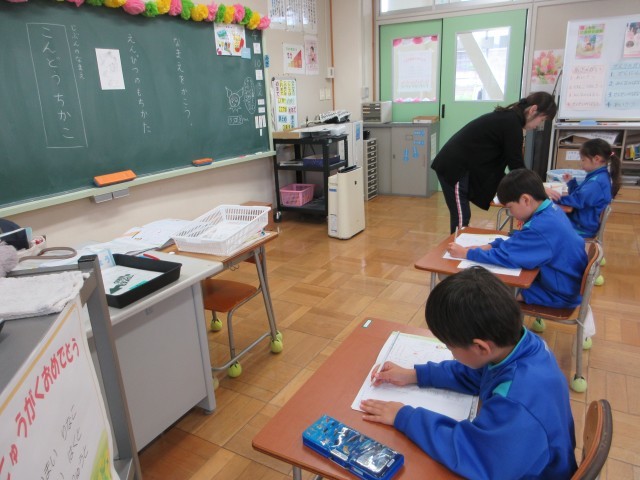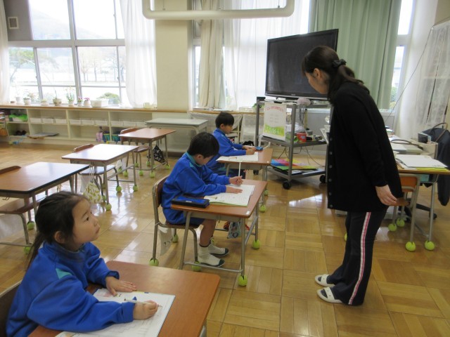 1年生も学習が始まりました。えんぴつを正しく持って,さあ,自分の名前を書いてみます。すると,みんな上手に名前を書くことができて,拍手です。