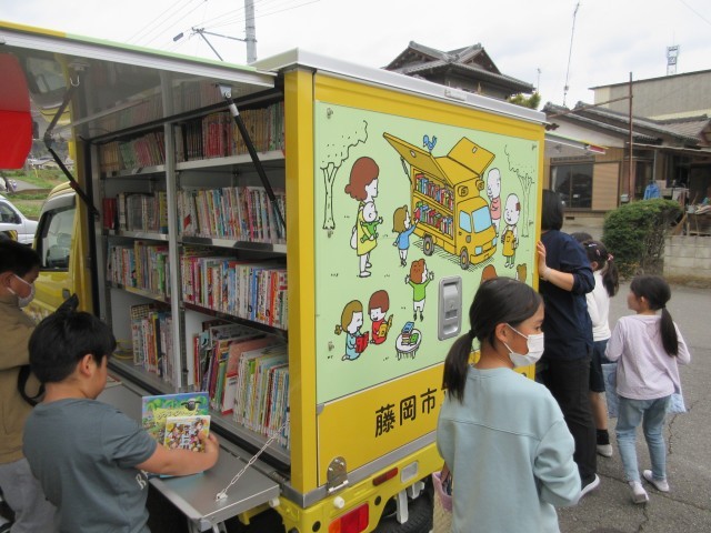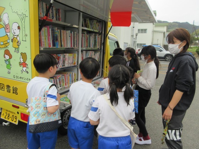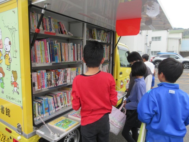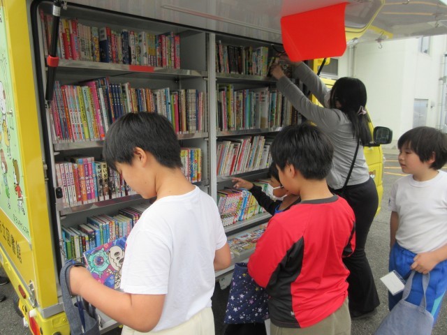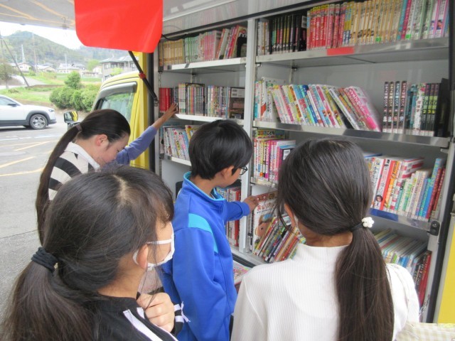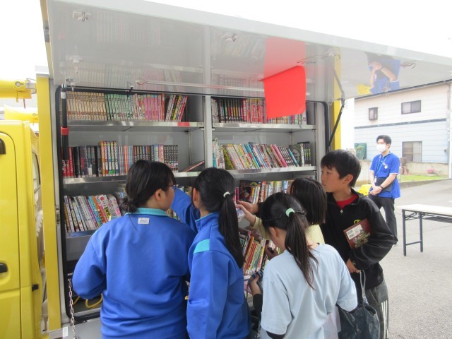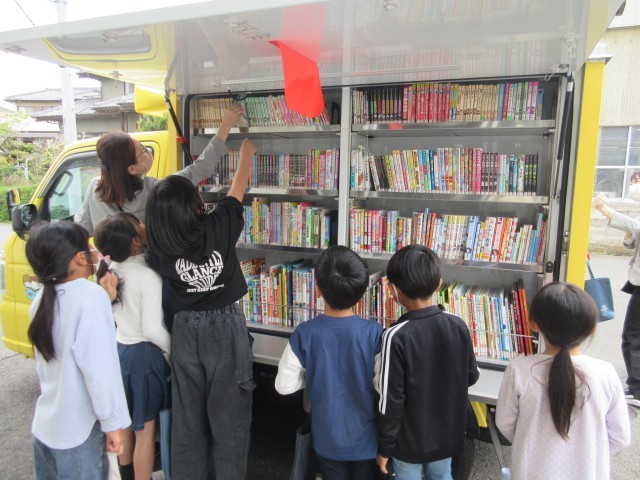 4月15日(水) 巡回移動図書【進んで学ぶ子】 公開日 2026/04/19 更新日 2026/04/19 できごと 1年ぶりに藤岡市立図書館の巡回移動図書が始まりました。ヨシタケシンスケさんの絵でデコレーションされた車が到着,みんなワクワクです。学年ごとに本を手に取り借りることができました。いろいろな本にふれる機会になります。 +4