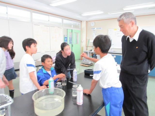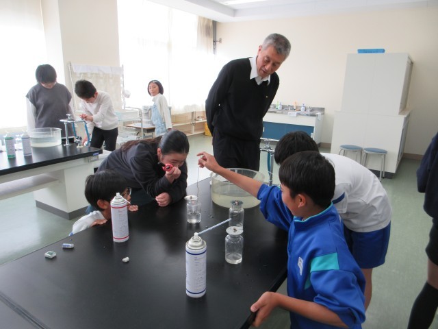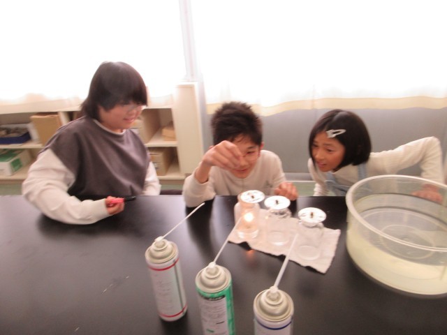 4月17日(金) 6年理科【進んで学ぶ子】 公開日 2026/04/20 更新日 2026/04/20 できごと 空気は,窒素,酸素,二酸化炭素,などから成ります。火はどの気体で燃えているのかを調べます。まず,集気瓶にそれぞれの気体を入れるのですが,それがなかなか難しく,そして,瓶にろうそくの火を入れるときには,タイミングよくふたを取ります。明らかに,酸素の中で明るく強く燃える様子が見られました。