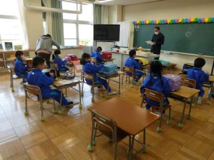 1年生は、ランドセルから出した物を片付けることから勉強します。