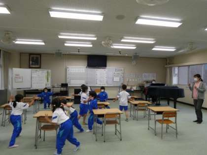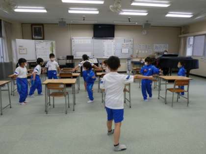 1年生の音楽は、「さんぽ」の曲に合わせて、元気に踊っていました。