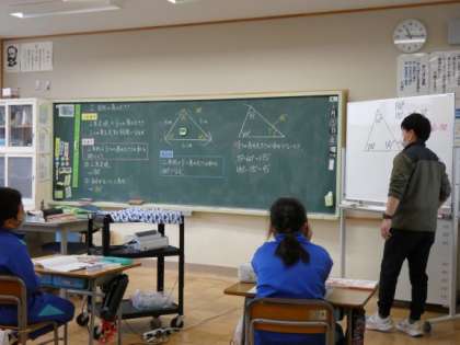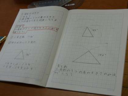 これまでの学びで3つの角について知っていることを生かして、180°になることを話合いました。また、外角や分からない角があったときの求め方も180°を使うと求められることが分かりました。