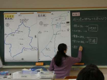 4月15日(金)群馬県の特徴を知ろう 公開日 2022/04/15 更新日 2022/04/15 できごと 4年生の社会科は、県の特徴を調べています。 よく分かるように群馬県と姉妹都市である羽咋市のある石川県の地図を並べて比較しました。 地形・交通など、共通しているところとちがうところが見つかりました。 また、県の特徴を調べていきましょう。