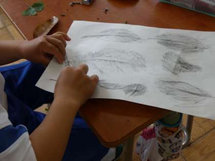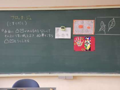 5月6日(金)葉を使って表現しよう 公開日 2022/05/06 更新日 2022/05/06 できごと 5年生の図工は、フロッタージュの授業でした。 校庭からさまざまな葉を拾ってきて、こすり出しをしました。 葉の形や模様を上手に使って、すてきな作品ができました。