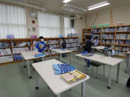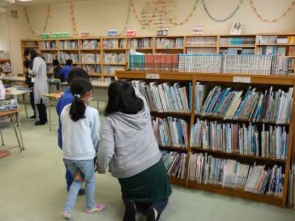 2年生が図書室で本を探していました。図書館司書の先生に尋ねて探している子もいました。