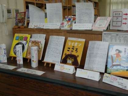 図書室のあるコーナーは、上級生からのおすすめの本が並んでいます。上手な推薦文が付いていて、感心しました。