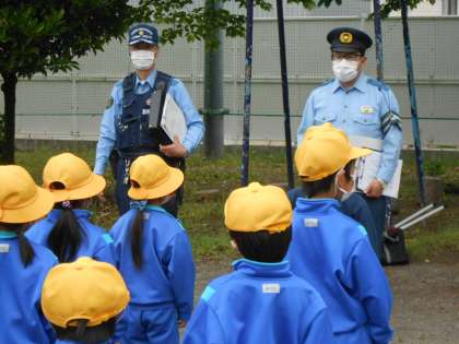 2校時に、藤岡警察署の方2名においでいただき、交通安全教室を行いました。はじめに校庭で安全に横断歩道を渡るための注意点について丁寧に説明していただきました。その後、郵便局前のT字路で実際に横断歩道を渡りました。信号機の他にも、周囲に充分気をつけて安全に横断歩道を渡ったり道路を通行しようとしたりする気持ちを高めてもらえたのではないかと思います。