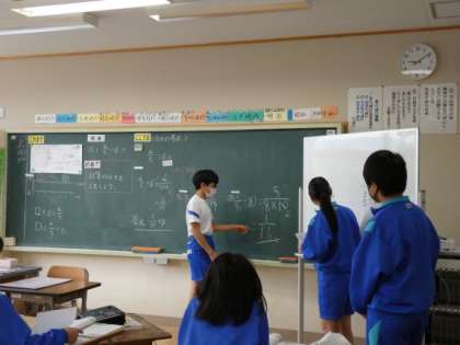 6年生の算数は、分数のわり算について「はかせ(はやい かんたん せいかく)」にできる方法を考える授業でした。