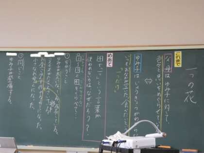 6月20日(月)4年生 国語 公開日 2022/06/20 更新日 2022/06/20 できごと 4年生の国語は「一つの花」の最後の場面でした。 「この場面だけ「一つだけ」という言葉が出てこないけれど、なぜかな?」という先生の問題に、違いと共通点などを挙げながら考えました。 答えそのものは物語に載っていないので難しかったと思いますが、言葉を手がかりに、主題に迫りました。