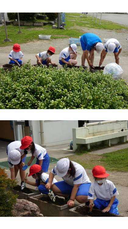 6月20日(月)マリーゴールド 移植 公開日 2022/06/20 更新日 2022/06/20 できごと 人権の花として種を蒔いたマリーゴールドの芽が大きくなってきたので、移植を行いました。 プランターの土の環境を整えたり、苗を植えたりする作業を6年生が1年生に丁寧に教えました。 たくさんの花が咲くように思いを込めて移植しました。 これから毎日水をあげたり様子をみたりして、大事に育てていきたいと思います。