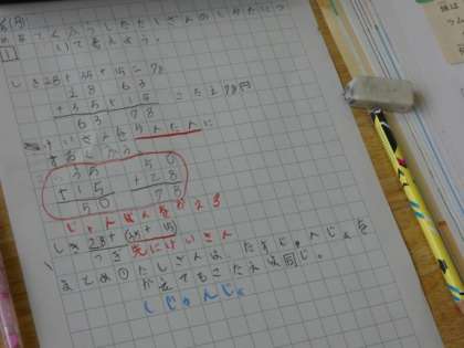 9月5日(月)3つの数の計算をしよう 公開日 2022/09/05 更新日 2022/09/05 できごと 2年生の算数は、3つの数のたし算の授業です。 1年生のときにも3つの数の計算を勉強しました。そのときのことを思い出して、ひとまとまりになる数を見つけ、( )を使って計算しました。 算数では、簡単にできることがポイントの1つになります。数に敏感になることが大切ですね。