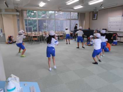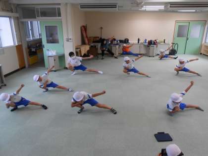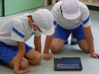 3・4年生合同の体育では運動会に向けてソーラン節の練習です。体育館は工事中、外は雨が降っているため、音楽室での練習となりました。手本を動画で確認しながら練習します。踊っている様子をタブレットで撮影しあい、それを見て自分の踊り方を確認し、次の練習に生かします。タブレットならではですね。