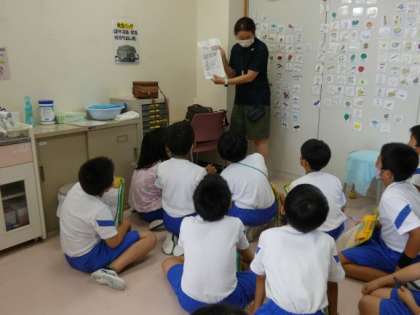 非常口や筋交いなどの被害から逃れるためのものを見つけたり、養護の先生からは、緊急用持ち出しバッグの役割やAEDについての話を聞いたりしました。