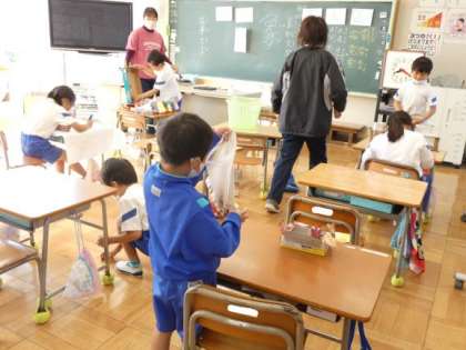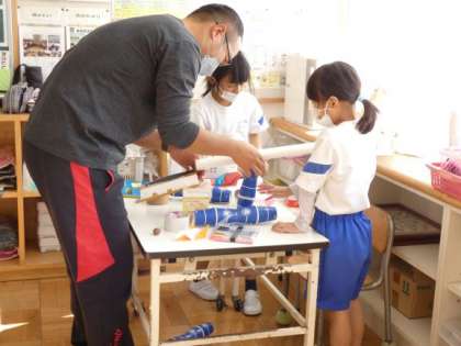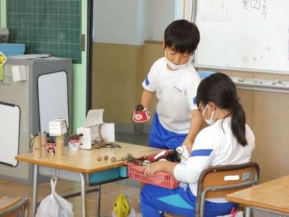 11月16日(水)秋まつりの準備をしよう 公開日 2022/11/16 更新日 2022/11/16 できごと 1年生の生活科は、秋まつりで遊ぶおもちゃつくりの時間でした。 今年度は、近隣の保育園の年長さんを招いて秋まつりをする予定です。 秋を感じながら楽しんでもらおうと、友達と協力しながら、おもちゃを制作していました。 アイデアいっぱいのおもちゃがたくさんできそうです。 これからも試行錯誤しながら、よりよいおもちゃを作る予定です。