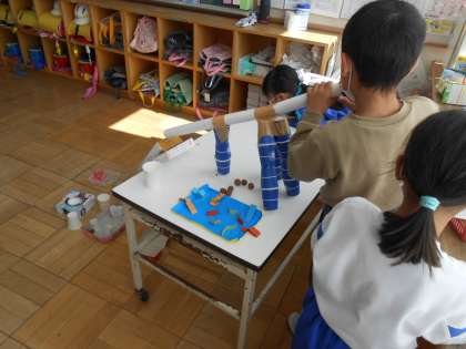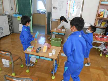 1年生はオープンスクールの日におうちの方に披露する「あきまつり」の準備をしています。今日はそのリハーサルです。たのしい遊びがいっぱいです。招待状も書きました。