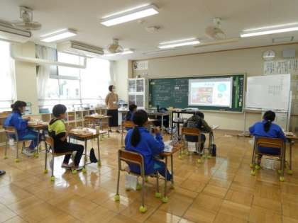 給食の時間に栄養士さんが来校し、5年生に食育指導をしてくださいました。