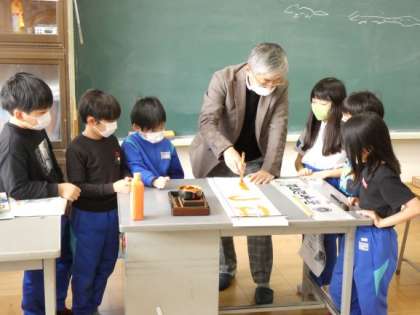 12月13日(火)書き初め練習3年生 公開日 2022/12/13 更新日 2022/12/13 できごと 3年生は、初めての書き初めです。 毎年、書道の先生をお招きして教えていただいています。 一人一人にお手本を書いて持ってきてくださいました。また、筆のバネを使って書くことや、穂先の向きなど、近くでじっくり見せてくださいました。みんな、自分が選んだ字を書いてほしくて、先生とじゃんけんになりました。 好奇心と関心の高さが伺える2時間の書き初め練習でした。