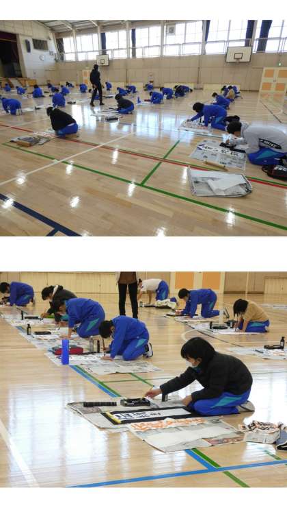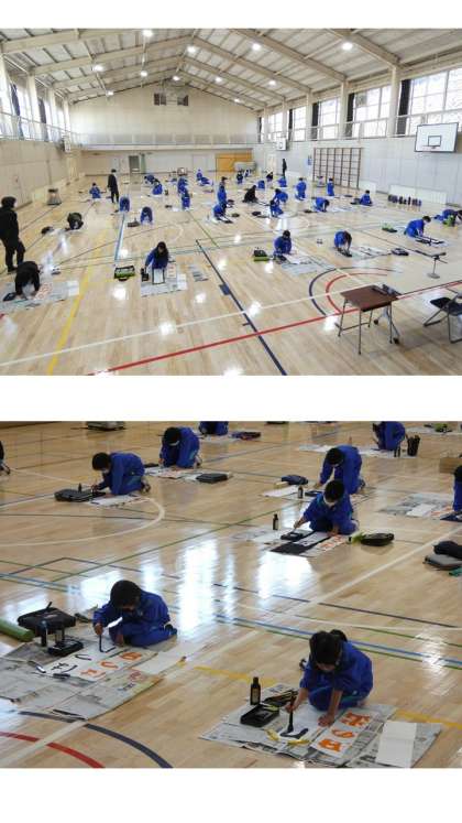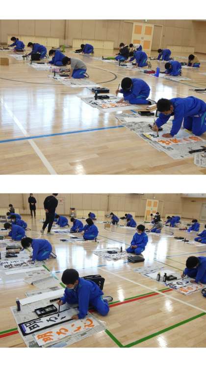 1月11日(水)書き初め大会 3〜6年生 公開日 2023/01/11 更新日 2023/01/11 できごと 3〜6年生は、体育館での書き初め大会です。 改修工事を終えて、ピカピカになった体育館での書き初めがとてもうれしそうでした。 習字の講師の先生が、一人一人に書いてくださったお手本を横に置き、全体のバランスを見、一画ずつ丁寧に確認し、2時間集中して書きました。 どの子の作品もどっしりして、力強さを感じます。