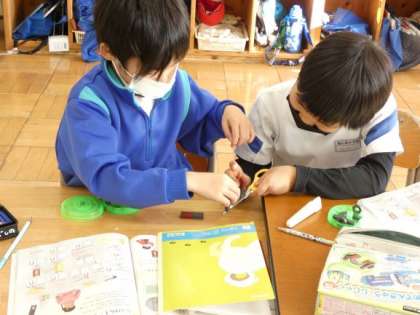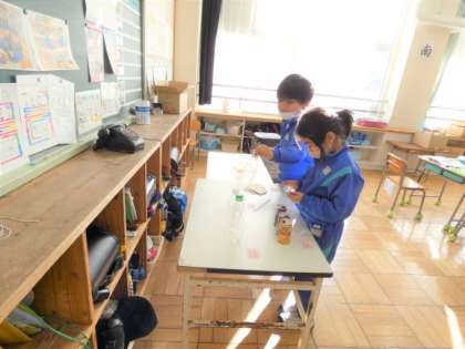 「(電気を通す物と通さない物の特徴調べの)次は、これをやっているの。」と教えてくれました。