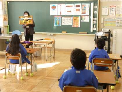 1月17日(火)そろばん教室 公開日 2023/01/17 更新日 2023/01/17 できごと 3年生の算数は、講師の先生をお迎えしてのそろばん教室です。 始めにそろばんの見方や使い方、基本的な言い回しなどを教えていただきました。 読み方などを練習し、たしざんの仕方を覚え、2時間熱心に勉強しました。 大きな数の桁を覚える歌も教えていただきました。 講師の先生には、お忙しい中大変ありがとうございました。