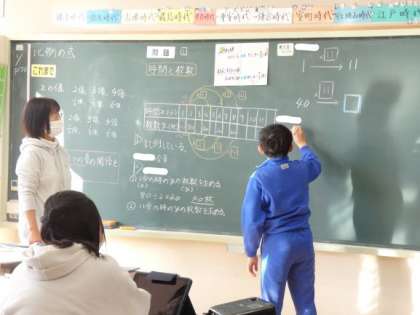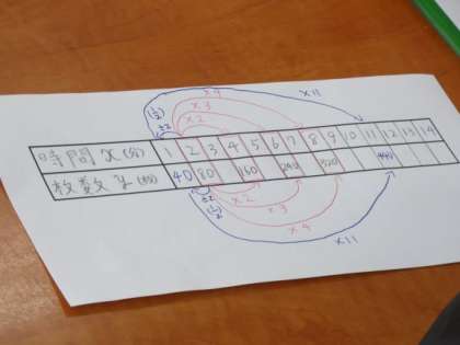 1月20日(金)比例と反比例 公開日 2023/01/20 更新日 2023/01/20 できごと 6年生の算数は、比例の授業です。 これまで表を使って、きまりを見つける勉強を積み重ねてきました。比例になることや、式に表すには「決まった数」がある、などの意見が子どもたちから出され、比例の式を作っていました。 「考えのヒント」や算数の用語を使って、考え方や説明の仕方をよく学び合いながら進めていました。