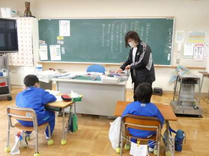 3月6日(月)国語 ひびき組 公開日 2023/03/06 更新日 2023/03/06 できごと ひびき組の国語や物語文の読みと詩の音読の授業です。 「初雪のふる日」の物語文では、場面読みをしました。あらすじを聞くと、不思議なことが起こったことやよもぎのおまじないの話をしてくれました。長い物語なのに、上手にまとめて話してくれました。 詩の音読では、先生の発音をよく聞いて、繰り返し練習することができました。