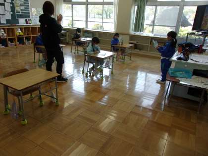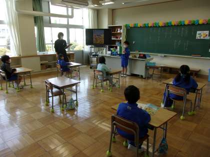 1年生の国語では、まずは教科書に慣れることから始めます。今日は、折り目でしっかりと折ってページを丁寧にめくったりしながら、表紙の裏のページにある「いいてんき」を読んだり、「いい天気って、どんな天気かな?」 「どこにいるのかな?」 「これは何かな?」など考えたり、発表したりしました。