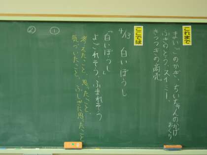 4月13日(木) 4年国語「白いぼうし」 公開日 2023/04/13 更新日 2023/04/13 できごと あまんきみこさんの「白いぼうし」の学習を今日から始めました。この教材では、登場人物の行動や会話から性格を想像したり、地の文に注目して読んだりしながら、登場人物の気持ちを捉える力を身に付けていきます。今日は、初発の感想を自由に発表しました。