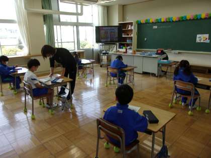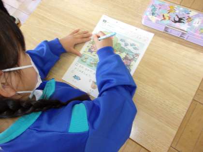 めあて「なかまを みつけよう」では、動物や果物など絵を見て仲間を見付けてくくりました。次時以降では、絵という具体物から、半具体物のブロックや○などに置き換え、数を数える勉強をしていきます。
