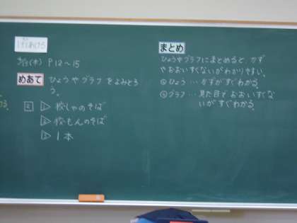 4月13日(木) 2年算数「せいりのしかた」 公開日 2023/04/13 更新日 2023/04/13 できごと めあて「ひょうやグラフをよみとろう」 教科書の絵をもとに、描かれている物の数を数えて、数字を書き込み表にしたり、描かれている物の数分を○で表しグラフにしたりして、そのよさを話し合いました。子どもたちは話合いを通して、表やグラフにまとめると、数や多い少ないが分かりやすくなることに気付くことができました。