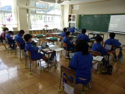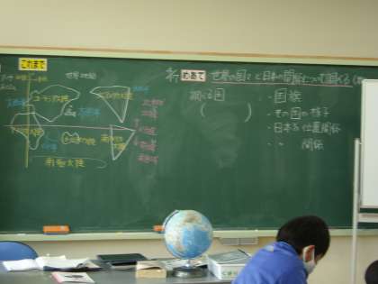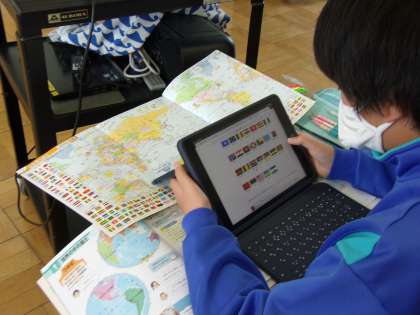 4月17日(月) 社会社会「世界の中の国土」 公開日 2023/04/17 更新日 2023/04/17 できごと 今日は、これまで学習してきた世界地図をもとに、調べたい国を個々に決め、1人1台端末や地図帳、地球儀などを用いて、その国の国旗や様子、日本との位置関係などを調べました。