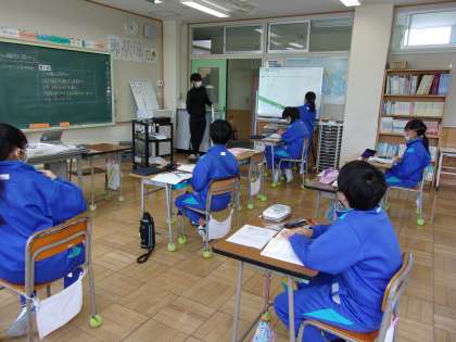 4月17日(月) 6年算数「対称な図形」 公開日 2023/04/17 更新日 2023/04/17 できごと 点対称の図形を用いて、実際に線を引く活動を通して、子どもたちは点対称の図形の対応する点同士を結んだ直線が必ず対称の中心を通ることや、対称の中心から対応するまでの長さが必ず等しくなることに気付くことができました。