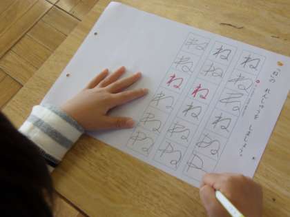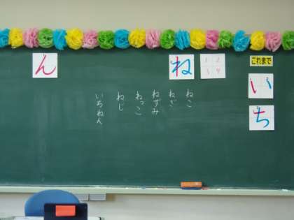 1年生は、国語でひらがなを勉強しています。今日は「ね」「ん」です。「ね」はバランスよく書くのは、ちょっと難しい文字です。どの子も1,2,3,4の部屋を意識しながら練習を積み重ねていました。