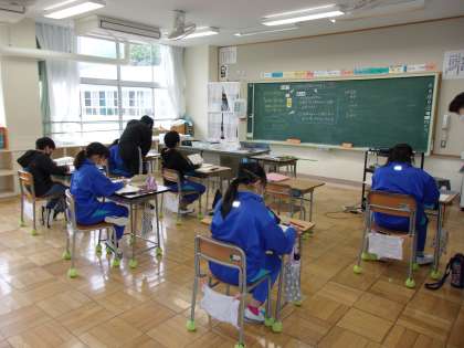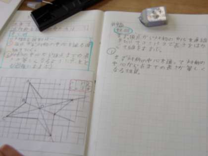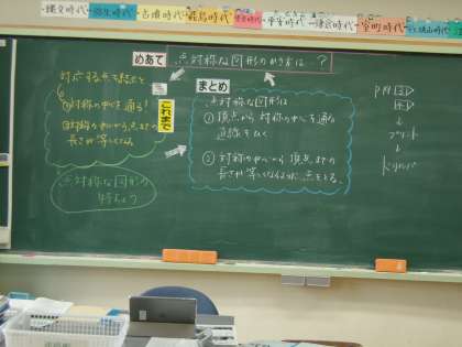 4月18日(火) 6年算数「対称な図形」 公開日 2023/04/18 更新日 2023/04/18 できごと 今日は、点対称な図形のかき方を、これまでの学習「対称の中心を通る」「対象の中心から点までの長さが等しくなる」をヒントに考えたり、実際にかいたりしました。