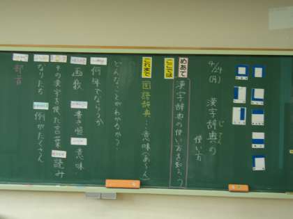 4月24日(月) 4年国語 公開日 2023/04/24 更新日 2023/04/24 できごと 先週「漢字の組み立て」で、漢字が「へん」や「つくり」などから構成されていることを学びました。今週は「漢字辞典の使い方」で、漢字辞典を使うことで「漢字の読み方」「成り立ち」「意味」「その漢字を使った語句」などを調べることができることを知るとともに、「音訓索引」「部首索引」「総画索引」を使った調べ方を知り、漢字辞典を使う練習をしていきます。