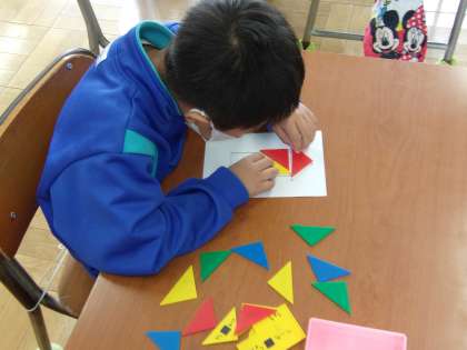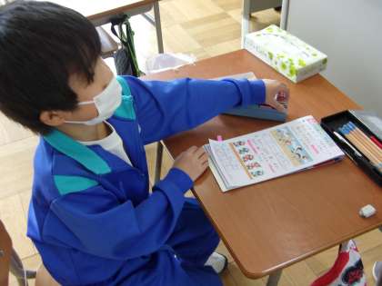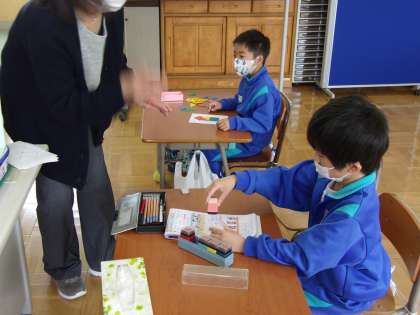 個に応じた算数の勉強を行いました。答え合わせをしたあとに、ご褒美の判子を自分で押し、満足げな様子でした。