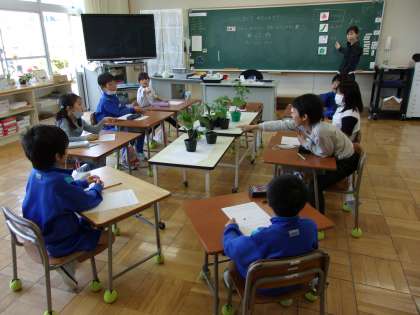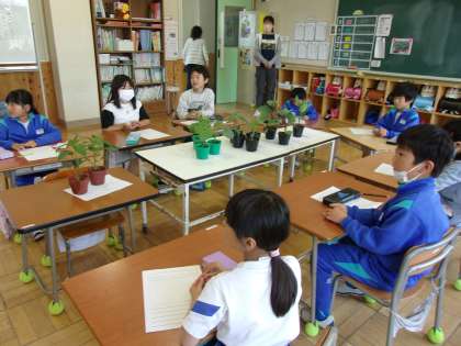 5月9日 2年生活科 公開日 2023/05/09 更新日 2023/05/09 できごと 「ぐんぐんそだて わたしのやさい」で、ミニトマト、キュウリ、ナス、ピーマンの苗を見て、どれが何の苗であるか予想をしてみました。そして、実際に苗をよく見たり、触ったり、匂いを嗅いだりしながら、苗の様子を絵や文字で表現しました。