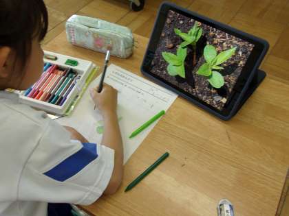 ここでは、植物の育ち方には一定の順序があることや、その体は根、茎及び葉からできていることを観察を通して学んでいきます。今日は、タブレットで撮影してきた植物をよく見ながら、気付いたことを絵や文字で表現しました。