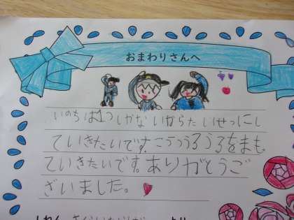 5月15日(月) 1年国語 公開日 2023/05/15 更新日 2023/05/15 できごと 先日実施した交通安全教室でお世話になったおまわりさんへ、心を込めてお礼の手紙を書きました。まだ、あいうえおの学習をしている最中ですが、どの子も上手に手紙を書くことができていました。
