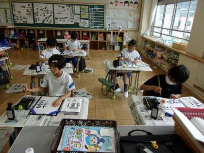 5月19日(金) 3年書写 公開日 2023/05/19 更新日 2023/05/19 できごと 3年生になり、毛筆の学習が始まりました。今日は、準備や後片付けの仕方や、実際に筆を持ち、筆使いの練習をしました。どの子も養父や床などを汚さないように、真剣に取り組んでいました。