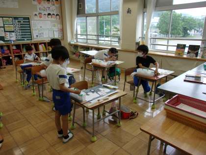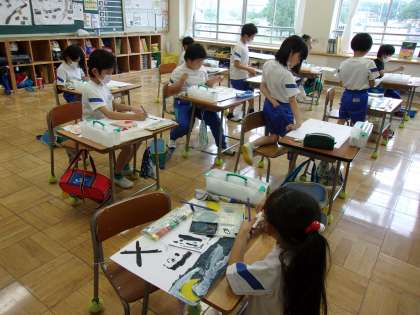 図工で、「少年の日絵画」を行っています。どの子も一生懸命になって絵の完成を目ざしていました。