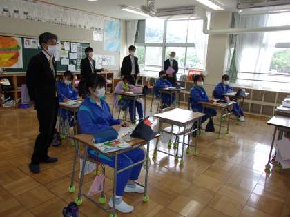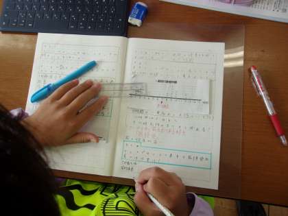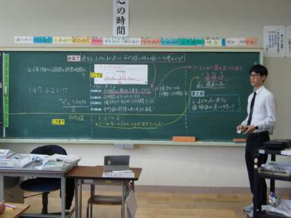 5月25日(木) 年度始訪問(6年) 公開日 2023/05/25 更新日 2023/05/25 できごと 今日は、めあて「表をドットプロットに表して、平均値以外の値について考えよう」を立て、ドットプロットを見て「平均値の前後にまとまりがある」「9時間の人数が1番多い」など気付いたことを出し合いました。そして、まとめでは「ドットプロットに表すと最頻値が見つけやすい」とまとめることができました。